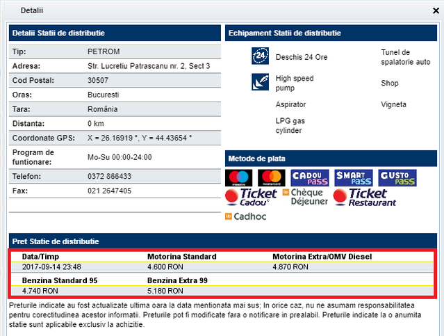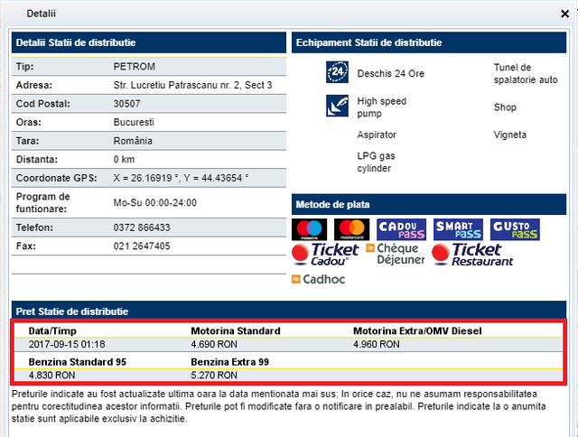 Joi seară, la ora 18, preţul carburanţilor la staţia OMV Petrom de pe strada Lucreţiu Pătrăşcanu era de 4,6 lei pentru litrul de motorină standard şi de 4,74 lei pentru litrul de benzină standard. Pentru motorina extra, preţul era de 4,87 lei pe litru, iar la benzina extra – de 5,18 lei pe litru.